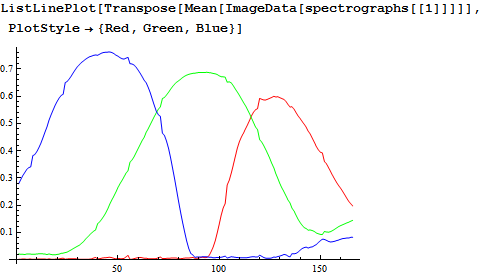 {edata, bdata, gdata, rdata}=Mean@ImageData@ColorConvert[#,"GrayScale"]&/@ spectrographs;