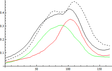 So I took three additional pictures, one with a water-filled cuvette and two cuvettes containing red and green dye, respectively. The first step in processing the data was to crop the images so that I was working with datasets containing only the diffracted light. Note that I have probably lost some resolution when I Imported/Exported the images, since the images from the RPi are approximately 2Mb in size but the Mathematica exported images are only 97 kB (although they are essentially all black). This is something to consider when working with this instrument for something more than a blog post… I loaded the images and then used ImageTake to grab just the portion of the image that contained useful information. {blank, empty, green, red}=Import[#]&/@{“blank.jpg”, “empty.jpg”,”green.jpg”,”red.jpg”};